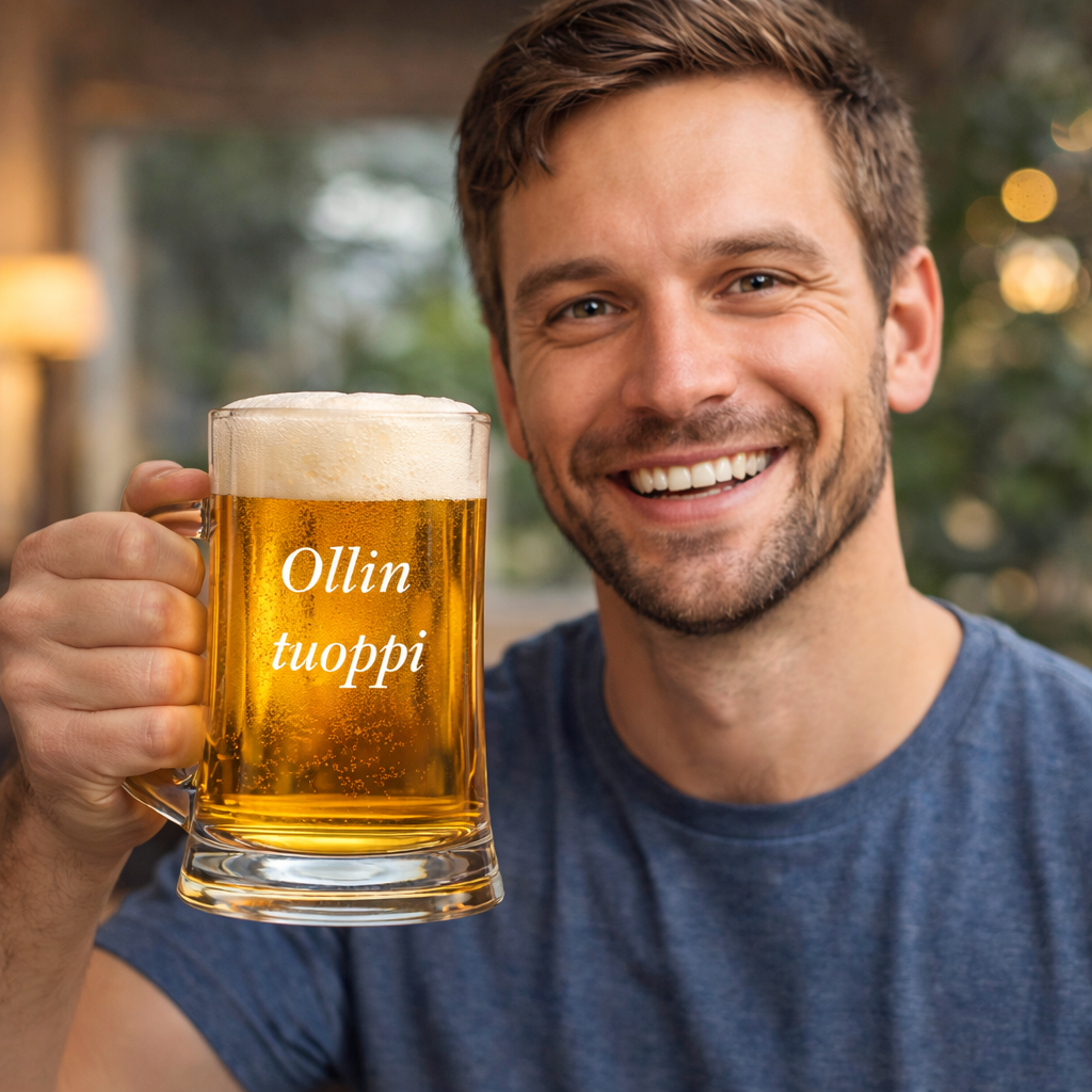 Lasin kruunaa asiakkaan tilaama teksti tai kuvio, joka kaiverretaan lasiin laserilla. Laserkaiverrus on kestävä, tyylikäs ja pysyvä – se ei kulu pesussa eikä haalistu käytössä. Erinomainen valinta persoonalliseksi lahjaksi, yrityslahjaksi tai omalla tekstillä varustetuksi suosikkilasiksi.