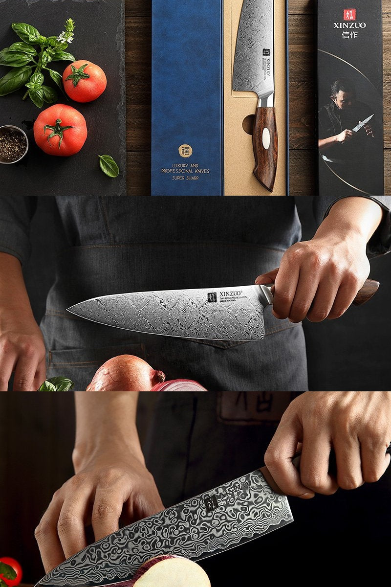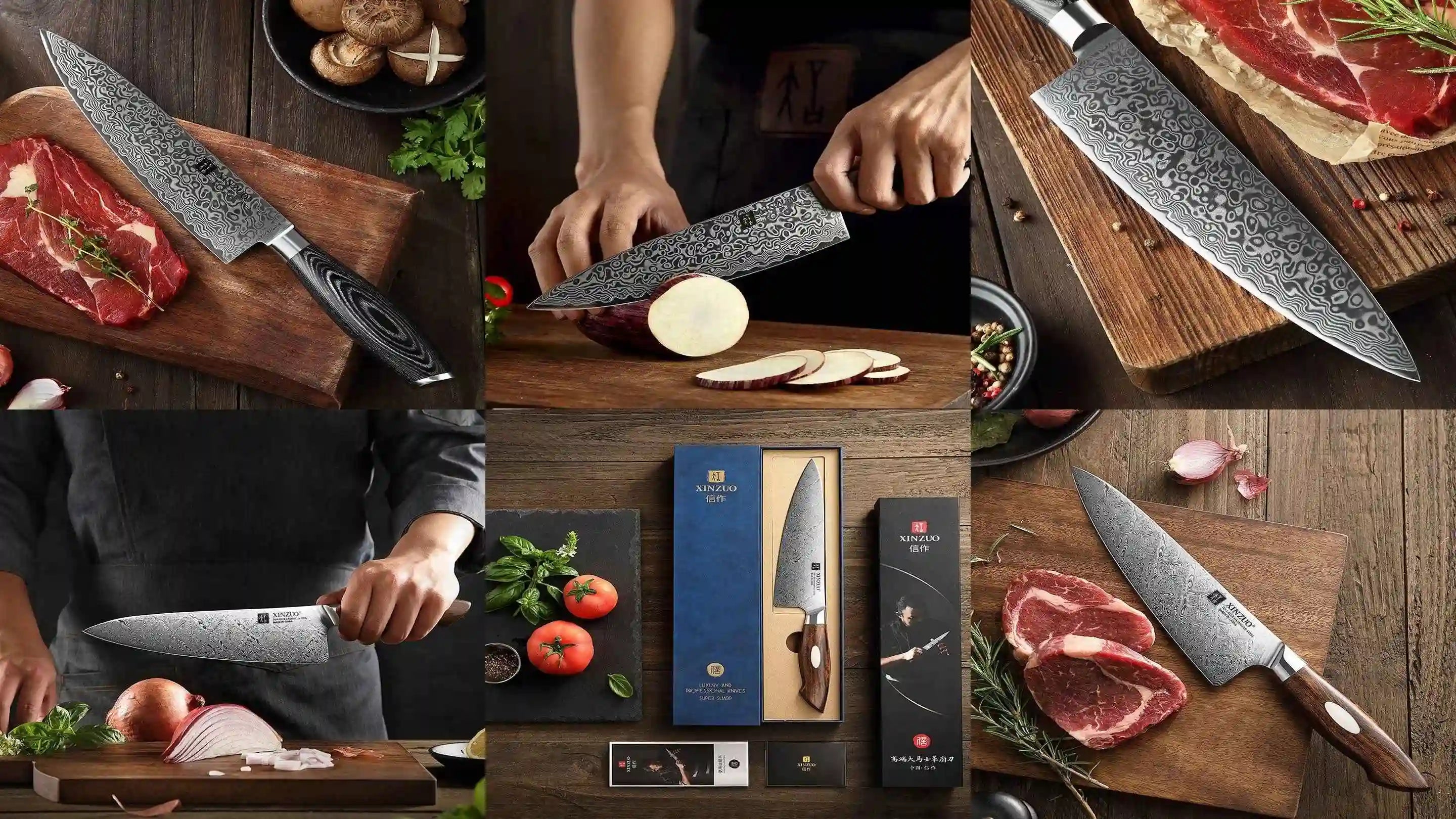 Kolme erilaista japanilaista keittiöveistä: vasemmalla Senzo Black -veitsi, keskellä kolme Senzo Classic -veistä ja oikealla Senzo Universal -veitsi, taustalla vihanneksia ja mausteita.