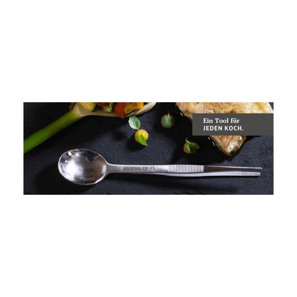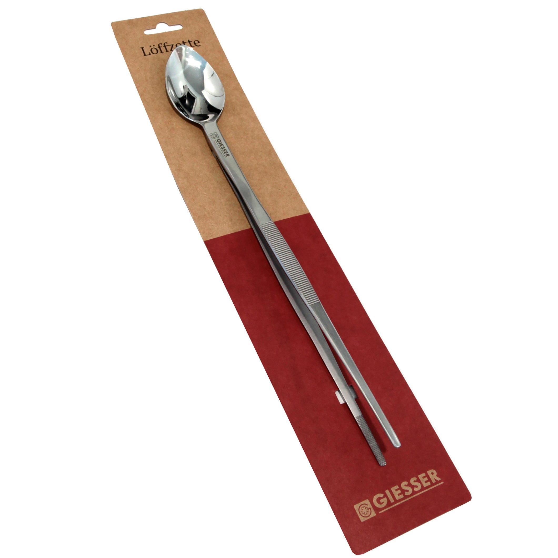 Giesserin kätevä keittiöatula, jonka toisessa päässä lusikka. Pituudet 17 cm ja 37 cm. Painot: 33 g ja 105 g.