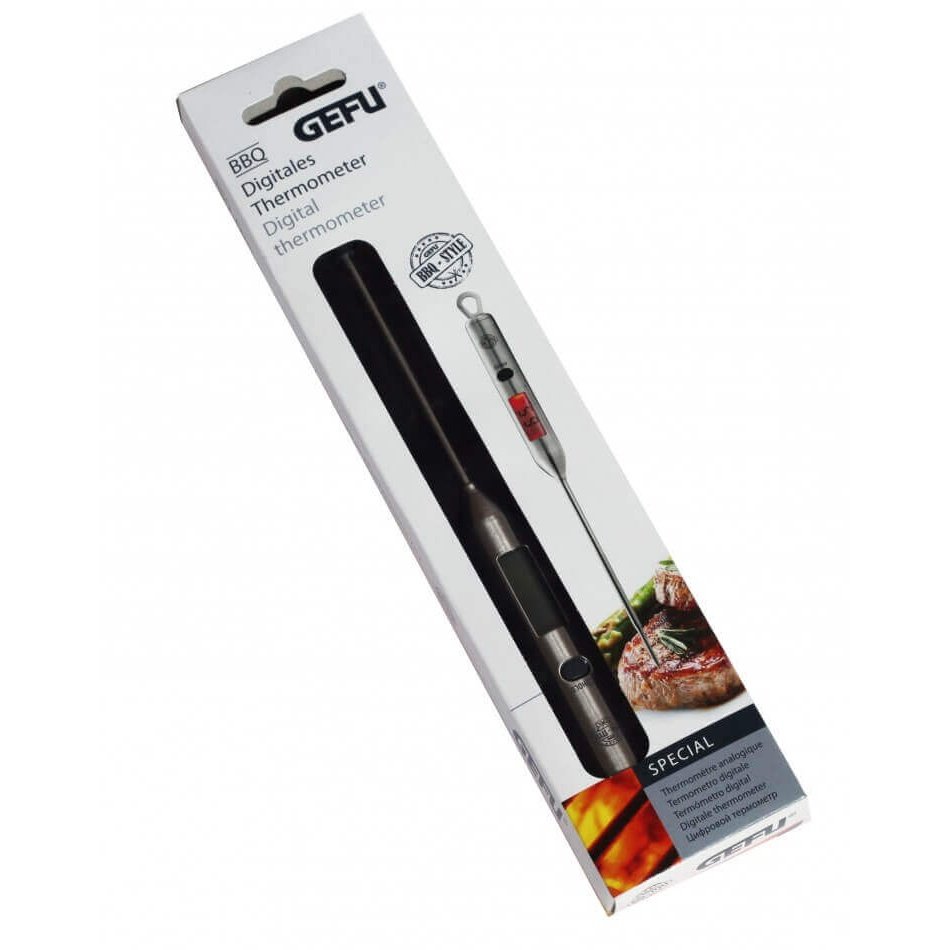 Gefun tarkka digitaalinen lämpömittari taustavalolla ja ripustuskoukulla. Voi seurata esim. kuumennettavan nesteen lämpötilaa kastikkeen valmistuksessa.