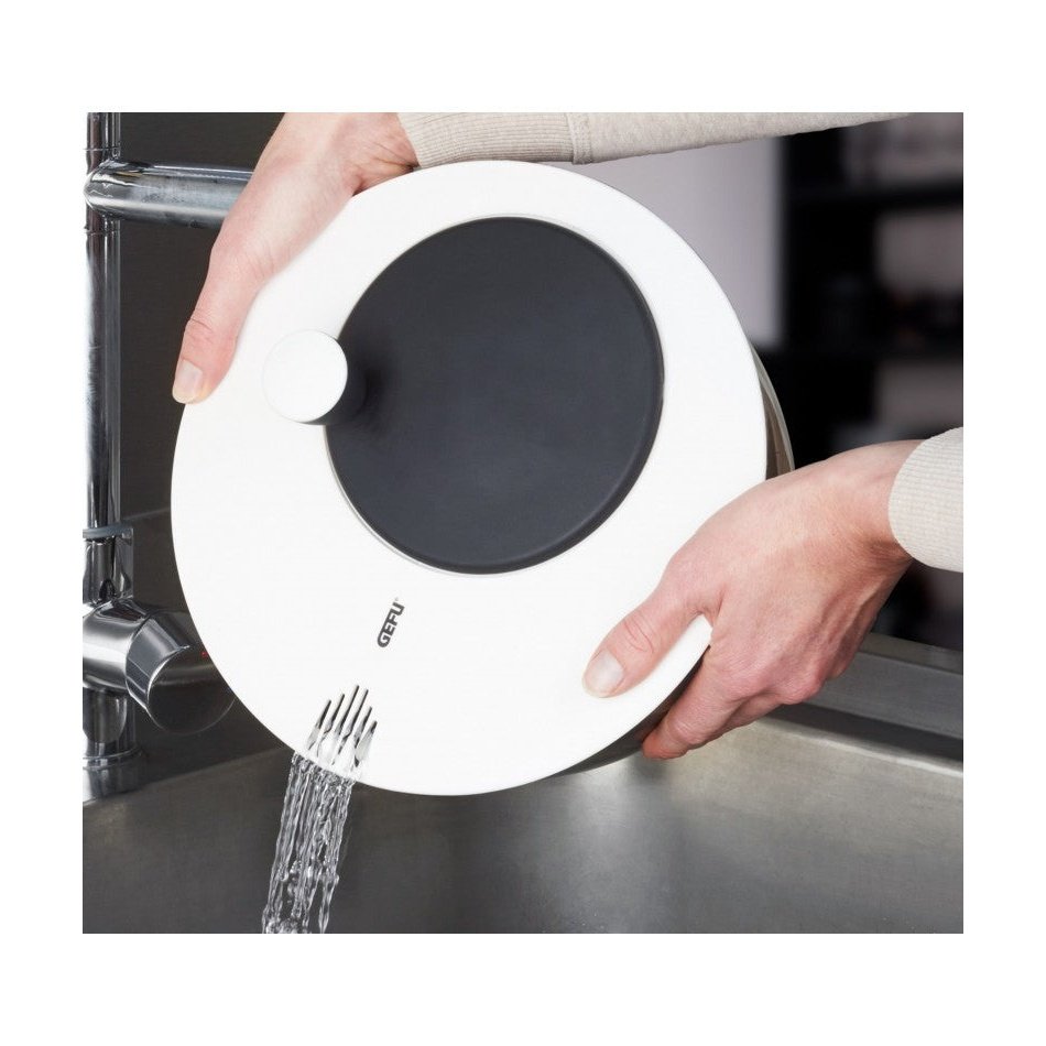Gefun salaattilingossa on perinteinen kampi mekanismi jota pyörittämällä salaatti kuivataan.
