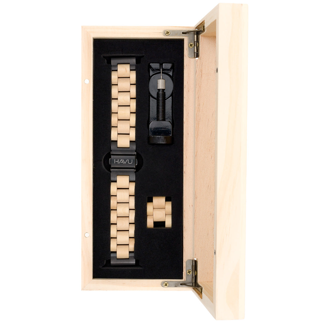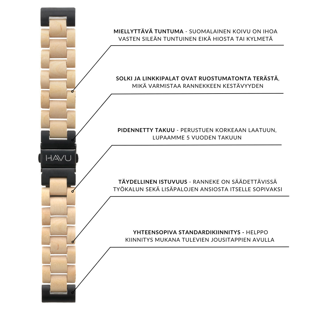 🌲 Raikas ja kevyt luonnonmateriaali kellosi viimeistelyyn! HAVU:n suomalaisesta koivusta valmistettu kellonranneke yhdistää skandinaavisen muotoilun, modernin tyylin ja luonnon keveyden. Vaalea puunsävy ja ainutlaatuinen syykuviointi tekevät jokaisesta rannekkeesta yksilöllisen, tarjoten kellollesi tyylikkään, luonnollisen ja modernin ilmeen.
