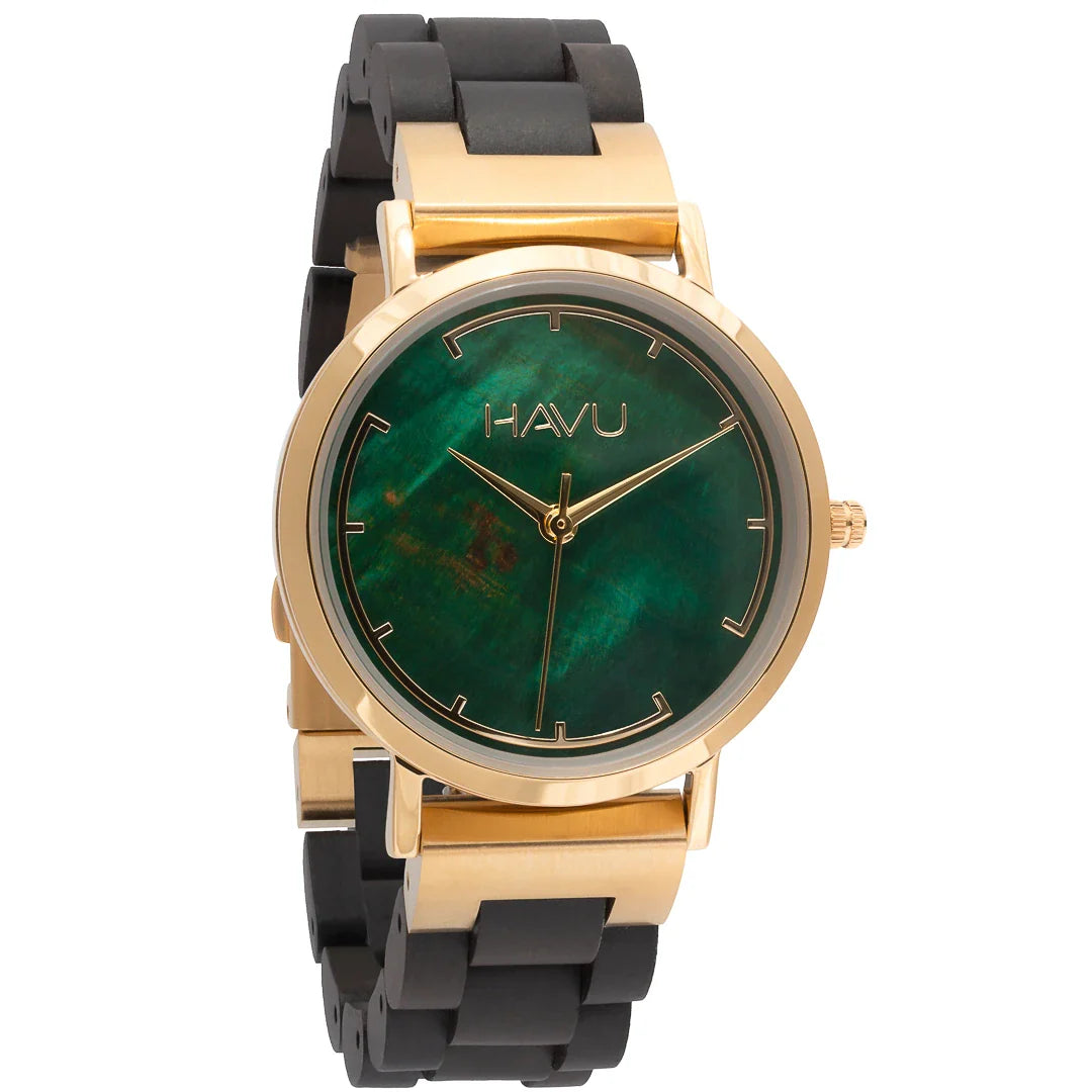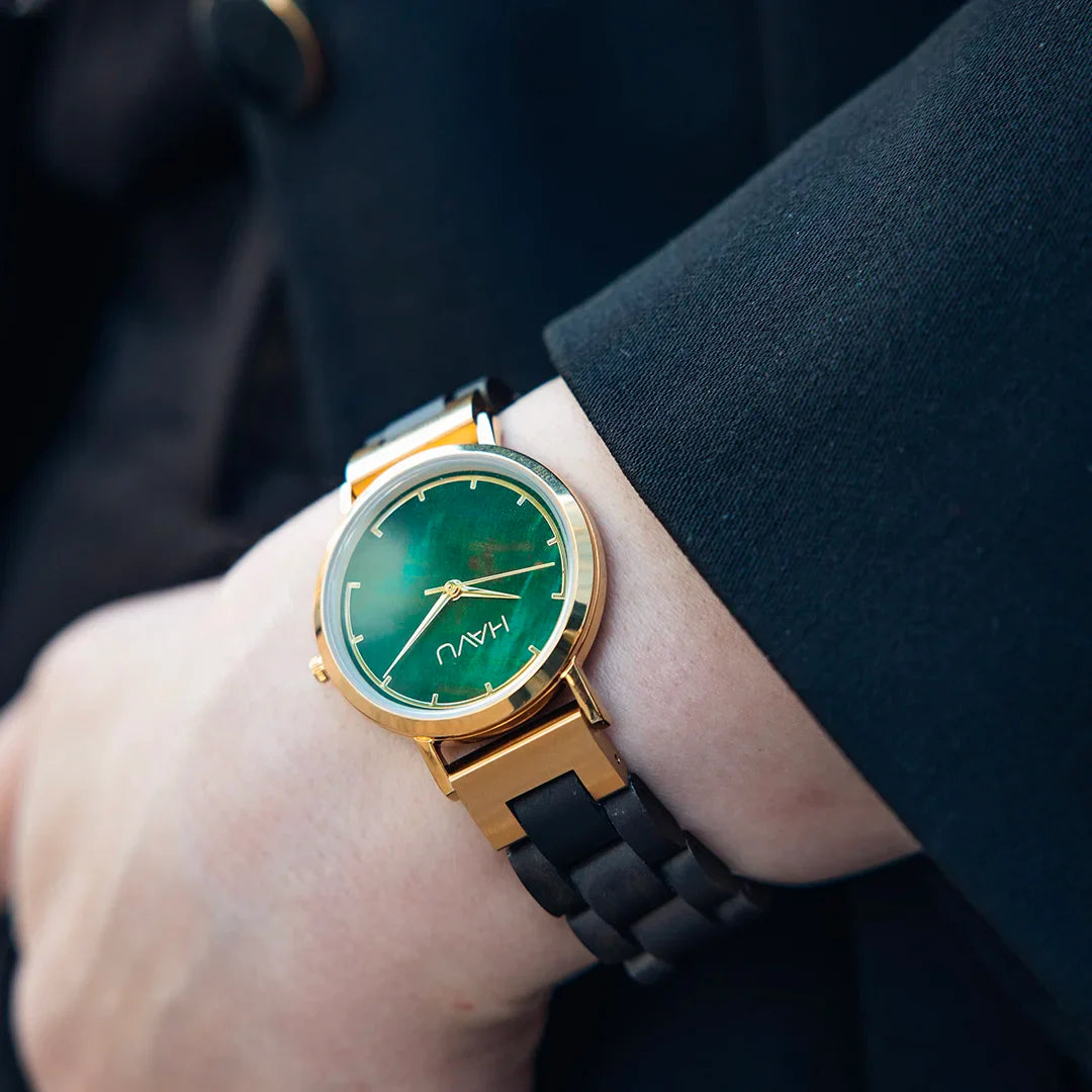 Revontulikellon kellotaulu on valmistettu aidosta suomalaisesta loimukoivusta, joka on vihreäksi stabiloitu. Stabilointi luo puuhun yksilöllisen värimaailman ja varmistaa sen kestävyyden. Tämä tekniikka on täysin uniikkia rannekelloissa.