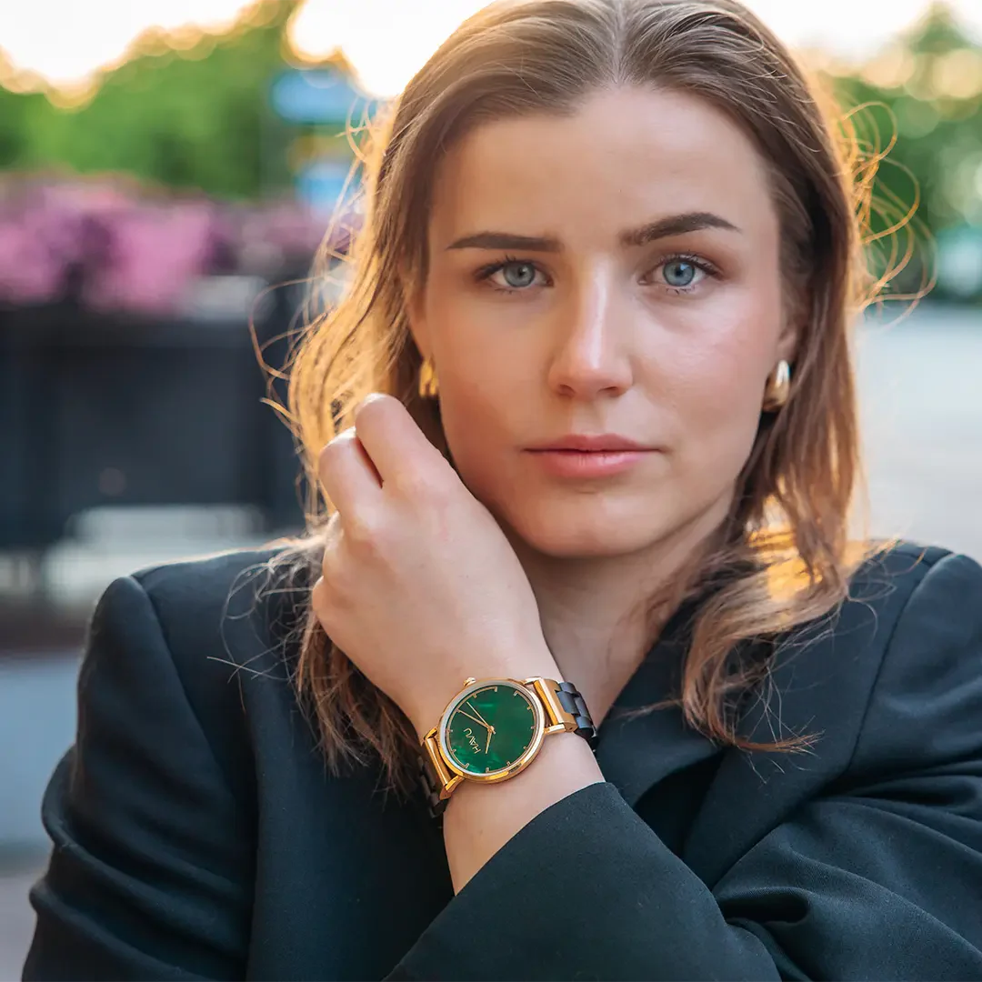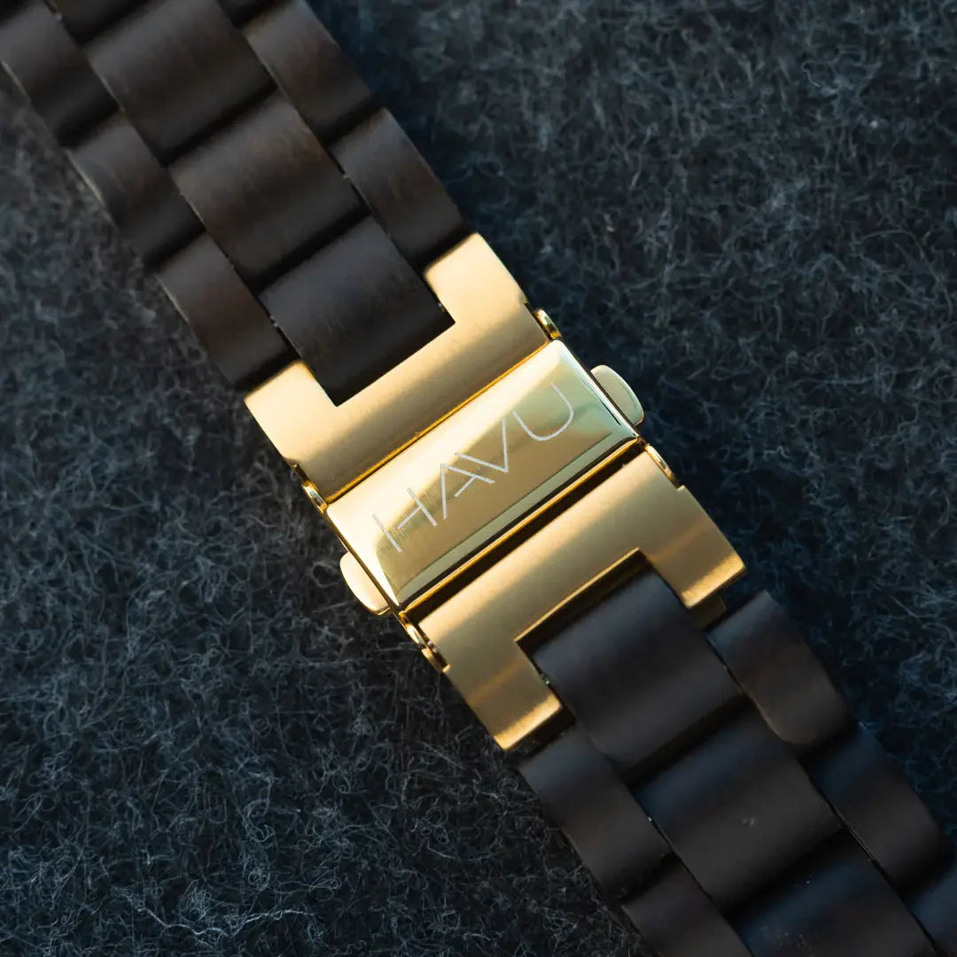 Kellotaulun ja rannekkeen lisäksi rannetta vasten nojaava tausta on puuta, jonka ansiosta kello tuntuu pehmeältä ja kevyeltä iholla. Valitsimme rannekelloon ensiluokkaiset materiaalit. Eebenpuu on arvostettu ja kestävä puumateriaali, jota on helppo työstää. Lisäksi se on kuvioltaan kaunis, joten se sopii kelloon erinomaisesti.