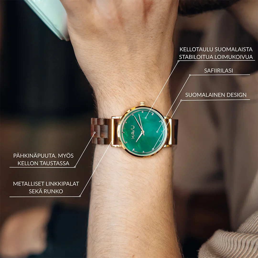 Revontulikellon kellotaulu on valmistettu aidosta suomalaisesta loimukoivusta, joka on vihreäksi stabiloitu. Stabilointi luo puuhun yksilöllisen värimaailman ja varmistaa sen kestävyyden. Tämä tekniikka on täysin uniikkia rannekelloissa.