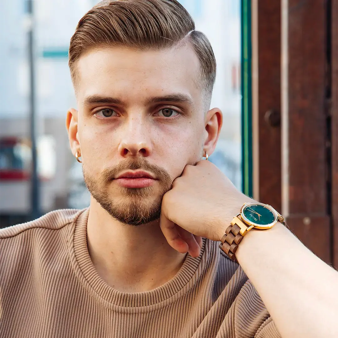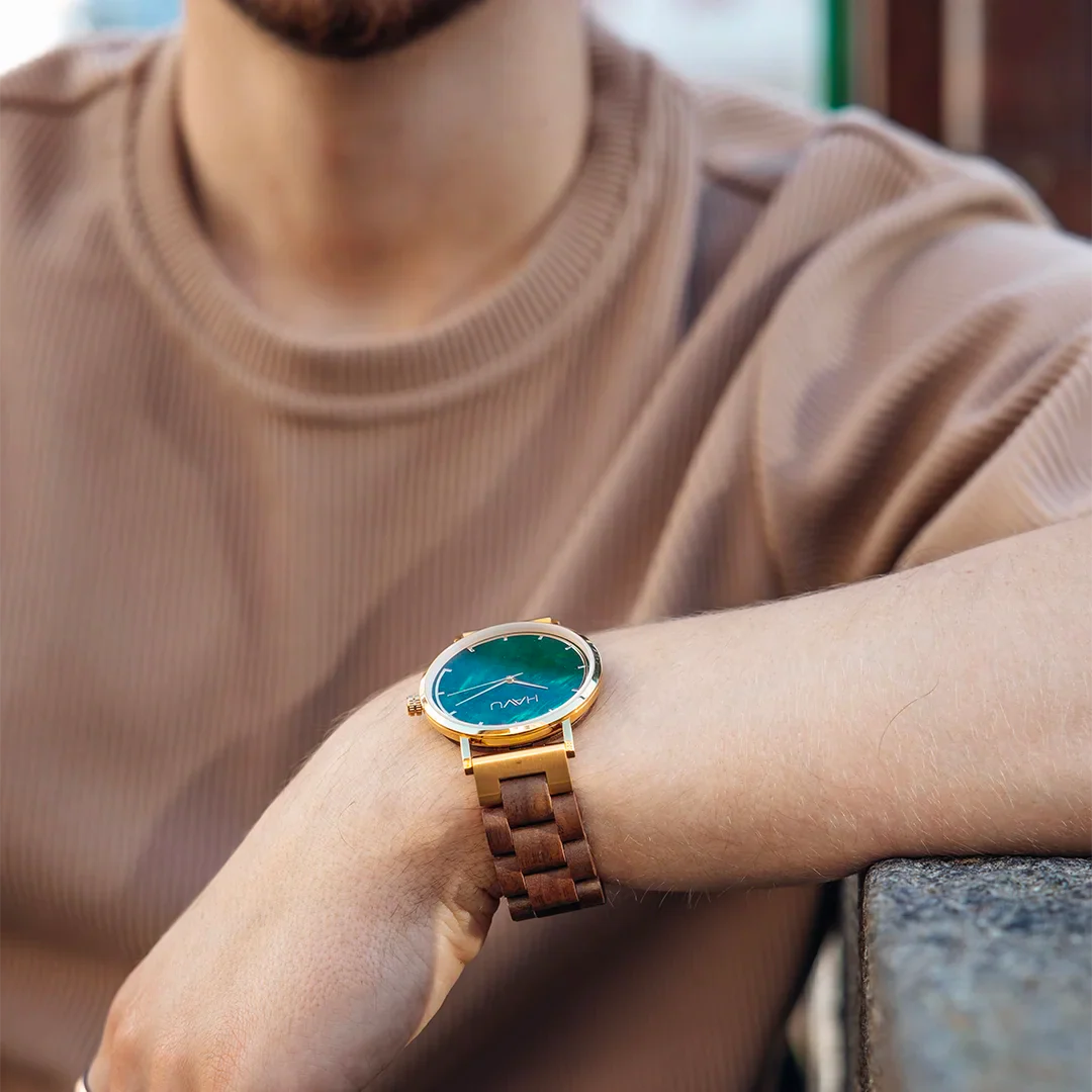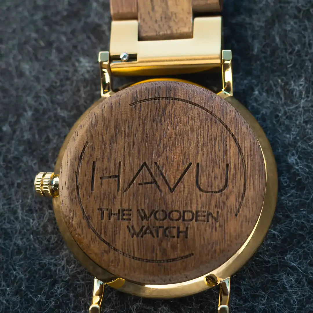 Kellotaulun ja rannekkeen lisäksi rannetta vasten nojaava tausta on puuta, jonka ansiosta kello tuntuu pehmeältä ja kevyeltä iholla. Valitsimme rannekelloon ensiluokkaiset materiaalit. Pähkinäpuu on arvostettu ja kestävä puumateriaali, jota on helppo työstää. Lisäksi se on kuvioltaan kaunis, joten se sopii kelloon erinomaisesti.