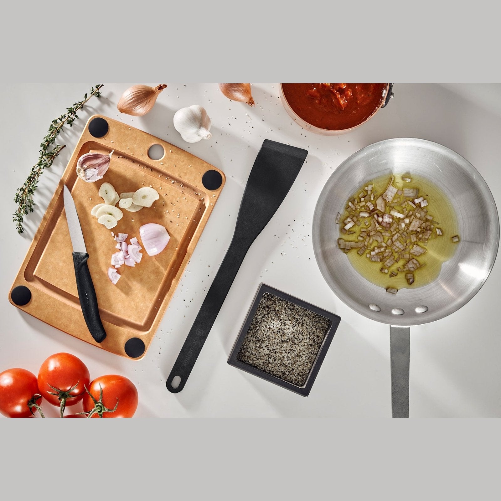 Materiaalissa on kimmoisuutta ("natural bounce") ja se on erittäin hellä veitsen terälle. Leikkuulauta kestää 175 °C:n kuumuuden, joten sitä voi käyttää myös pannunalusena. Ulkoreunaa kiertävä ura kerää esim. lihojen ja hedelmien käsittelyssä syntyvät nesteet, ja myös kulmien liukuesteet sekä ripustusreikä lisäävät leikkuulaudan käytännöllisyyttä. Materiaali koostuu paperiarkeista, jotka prässätään yhteen lämmön ja paineen avulla. Lopputuloksena on vankka, tasapainoinen ja kestävä materiaali. Kaikki tuotantoprosessin aikana syntyvä jäte ja ylijäämämateriaali pyritään minimoimaan, käyttämään uudelleen tai kierrättämään aina kun mahdollista. Myös lämpö otetaan talteen, ja käytetään varastotilojen lämmittämiseen talvella. Materiaalilla on mm. GREENGUARD- ja FSC® -sertifikaatit.