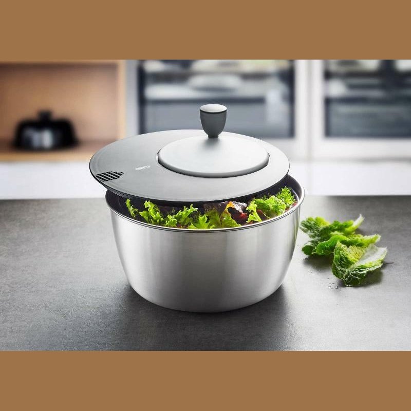 Gefu Rotare salaattilinkoa on ilo käyttää: se on varustettu tyylikkäällä jaloteräskulholla, johon voi kätevästi kattaa salaatit suoraan pöytään. Lingon vetomekanismi ja jarrunappi tekevät kuivaamisesta erityisen tehokasta. Kannen reunan reiät mahdollistavat ylimääräisen veden valumisen, jolloin salaatti ei vetisty.