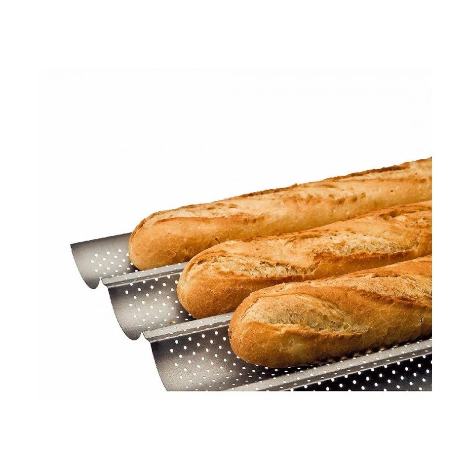 Non-stick pinnoitettu pelti patonkien paistamiseen. Neliuraisessa pellissä rei'itys rapean kuoren paistamista varten Non-stick pinnoitettu pelti patonkien paistamiseen.