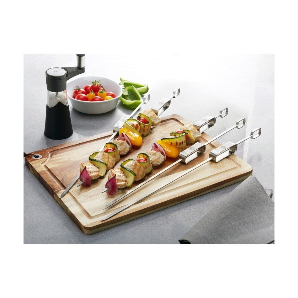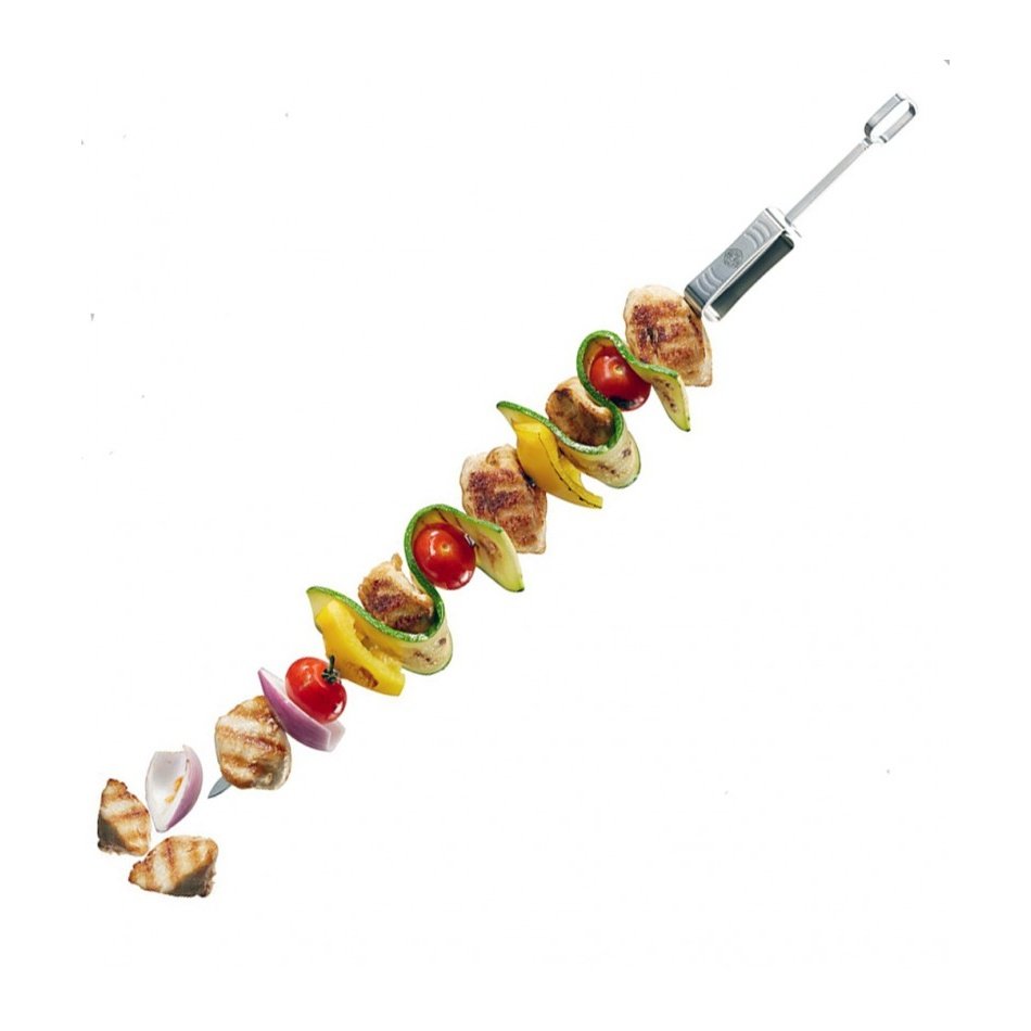 Gefun pitkät kulmikkaat grillivartaat, ruoka-aineet eivät pyöri. Liukutyöntimellä ruoka on helppo työntää vartaasta lautaselle.