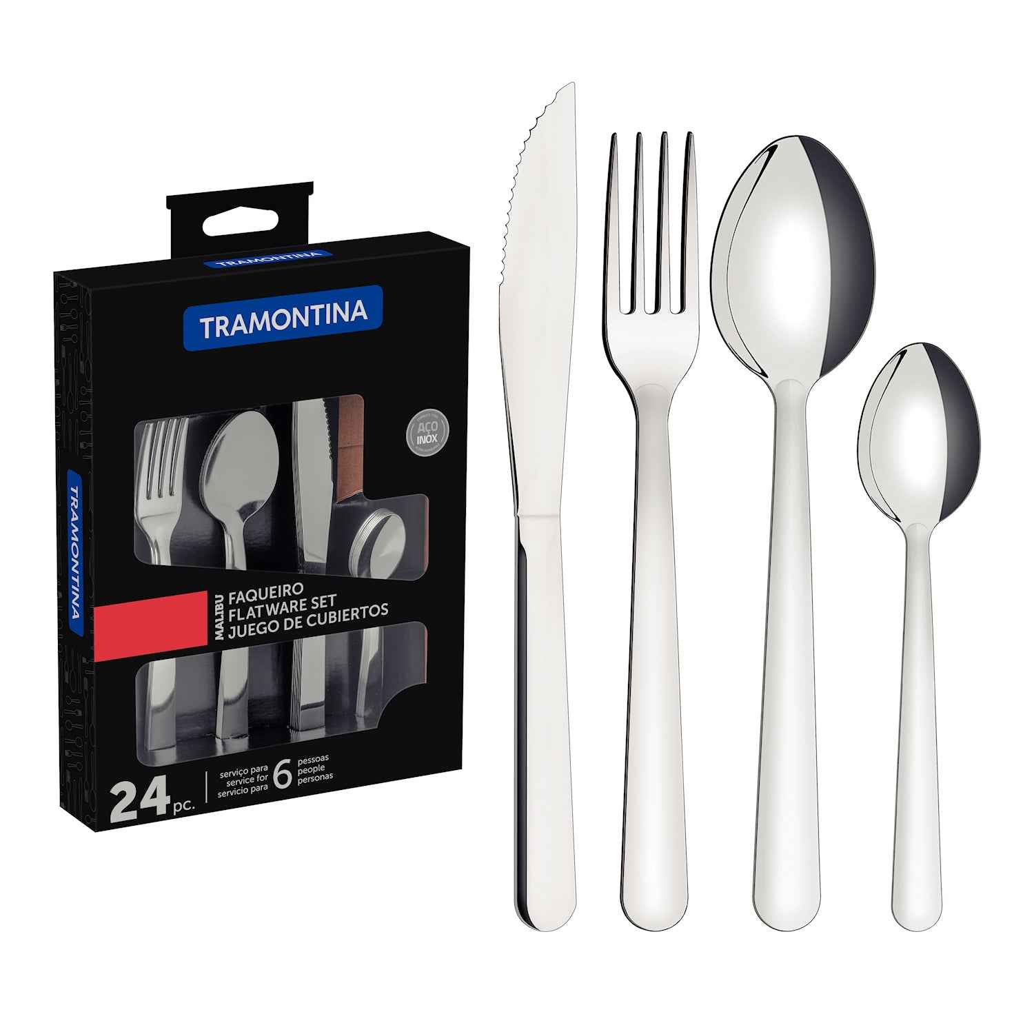 Koe elegantti illalliskokemus Tramontina Malibu aterinsetin avulla, joka on valmistettu ensiluokkaisesta ruostumattomasta teräksestä. Tämä 24-osainen setti sisältää kaiken tarpeellisen, jotta voit kattaa upean pöydän: 6 pihviveistä, 6 haarukkaa, 6 ruokalusikkaa, ja 6 teelusikkaa. Jokainen aterin on suunniteltu paitsi olemaan tyylikäs, myös pitkäikäinen ja kestävä.