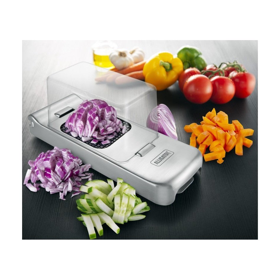 Pilkottavat ainekset laitetaan Alligatorin suuhun, painetaan kansi alas, ja teräväreunainen teräsristikko leikkaa. Jos haluat suikaleet kuutioiksi, aseta suikaleet uudestaan Alligatoriin ja paina toisen kerra! Kannen päällä oleva kupu kerää leikatut kasvikset talteen. Teräksinen Alligator on paitsi kestävä, myös terävalikoimalaltaan deluxe-tasoa: siinä on 3 x 3 mm terät esim. valkosipulille, 6 x 6 mm terät esim. sipulille ja 12 x 12 mm terät esim. ranskalaisille perunoille.
