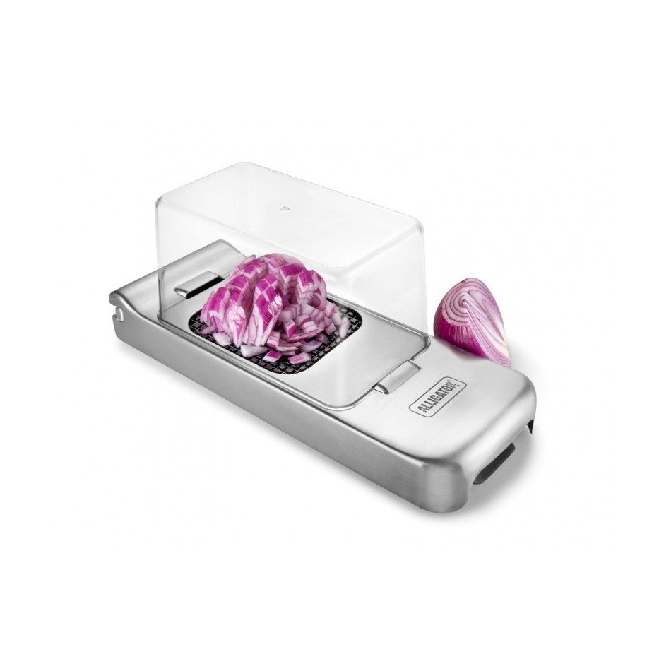 Sipulit menevät kuutioiksi nopeasti ja ilman kyyneliä, kun Alligatorin leuat napsahtavat. Alligatorilla pilkot kasvikset kuutioiksi tai suikaleiksi.