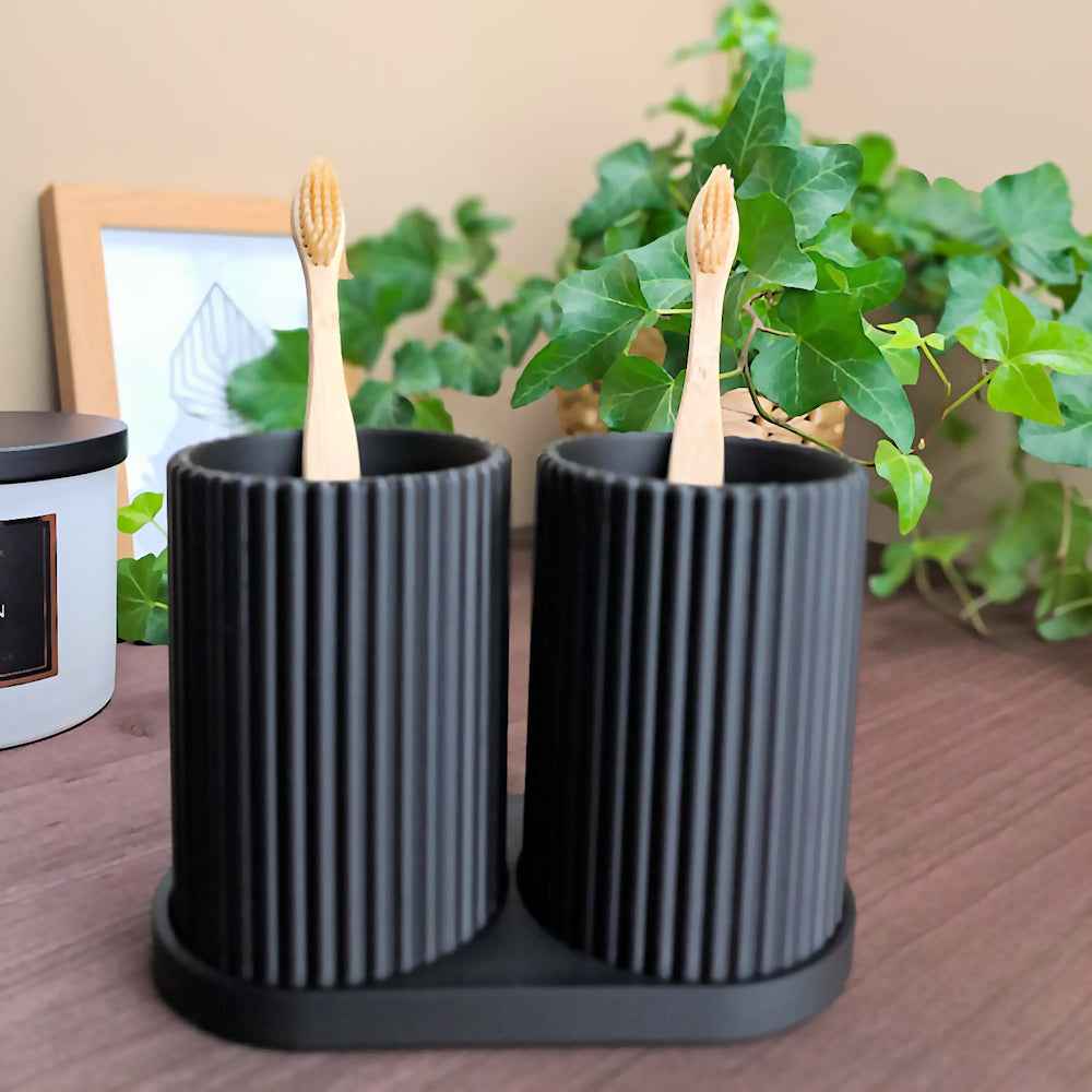 Tyylikäs ja käytännöllinen hammasharjateline pitää välineet järjestyksessä. Telineessä on kaksi upotettua paikkaa varten, mikä tekee kokonaisuudesta vakaan ja siistin.
