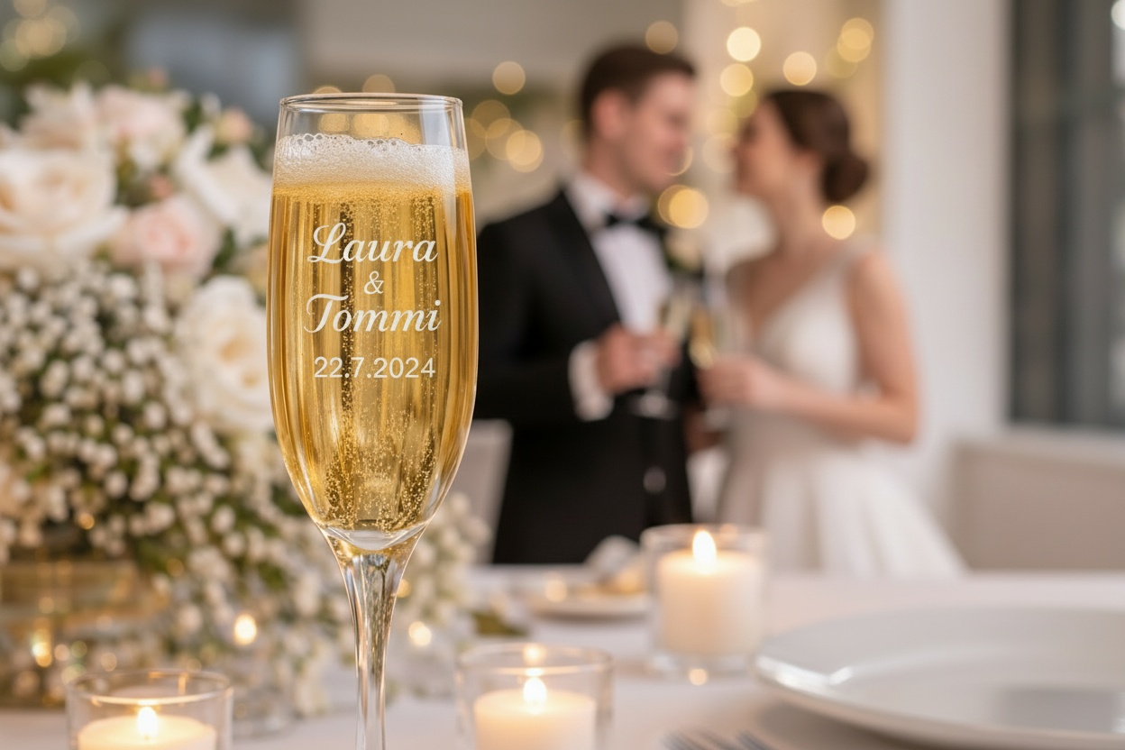 Lasin voi personoida asiakkaan omalla tekstillä tai kuviolla, joka kaiverretaan lasiin laserilla. Laserkaiverrus on pysyvä, tarkka ja tyylikäs – se ei kulu käytössä eikä pesussa. Personoitu shampanjalasi on suosittu valinta häihin, merkkipäiviin ja yrityslahjoiksi.