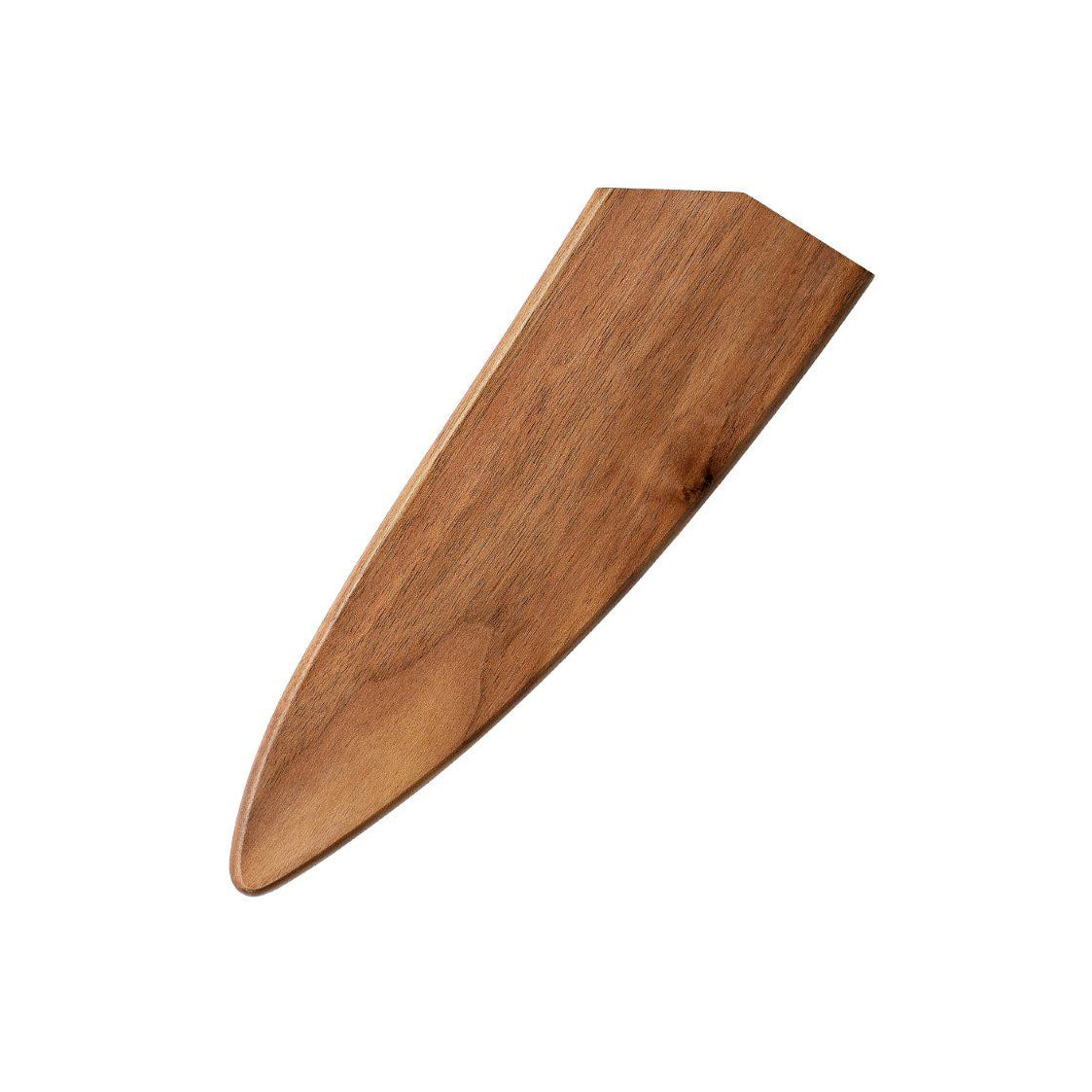 Pähkinäpuusta valmistettu teräsuoja kokkiveitselle: teräpituus enintäin 21 cm ja terän suurin leveys entåin 5,8 cm . Suojassa on magneetti joka pitää suojan paikoillaan. Suoja on mitoitettu Jiang sarjan kokkiveitselle. Sopii myös muille leveäteräisille veitsille, mm.  Suncraft ja Yaxell veitsille.
