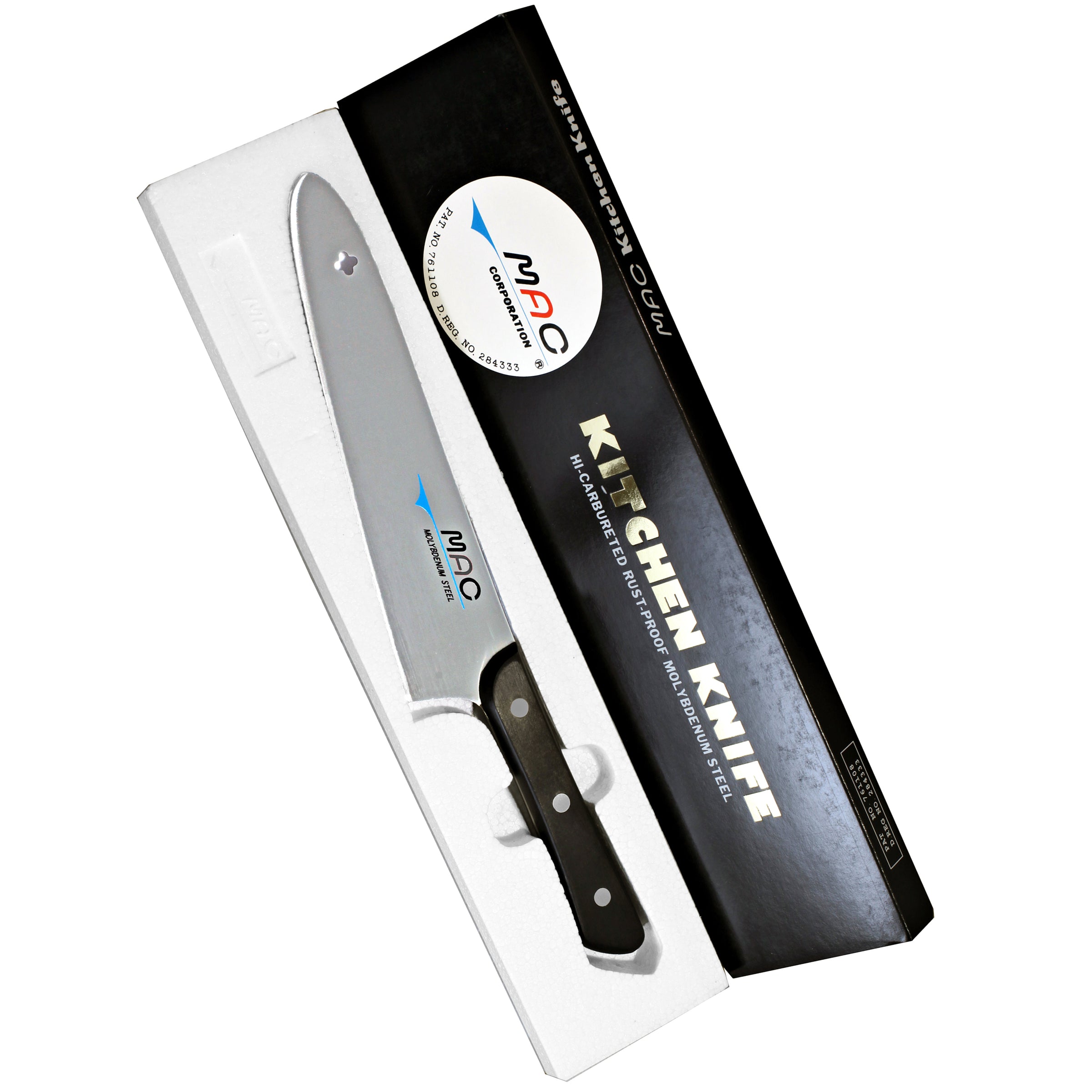 Ohutta partaveitsenterävää runsashiilistä ruostumista vastustavaa MAC - hiiliterästä. Ohut ja hieman joustava terä viipaloi vaivattomasti. Ergonominen ylös kaartuva kahva jättää hyvin tilaa sormille ja samalla mahdollistaa luonnollisen leikkaamisen ja lisää käyttömukavuutta. Pyöristetty kärki turvallisuutta lisäämään ja kätevä ripustusreikä terässä. Ei kone pestävä!