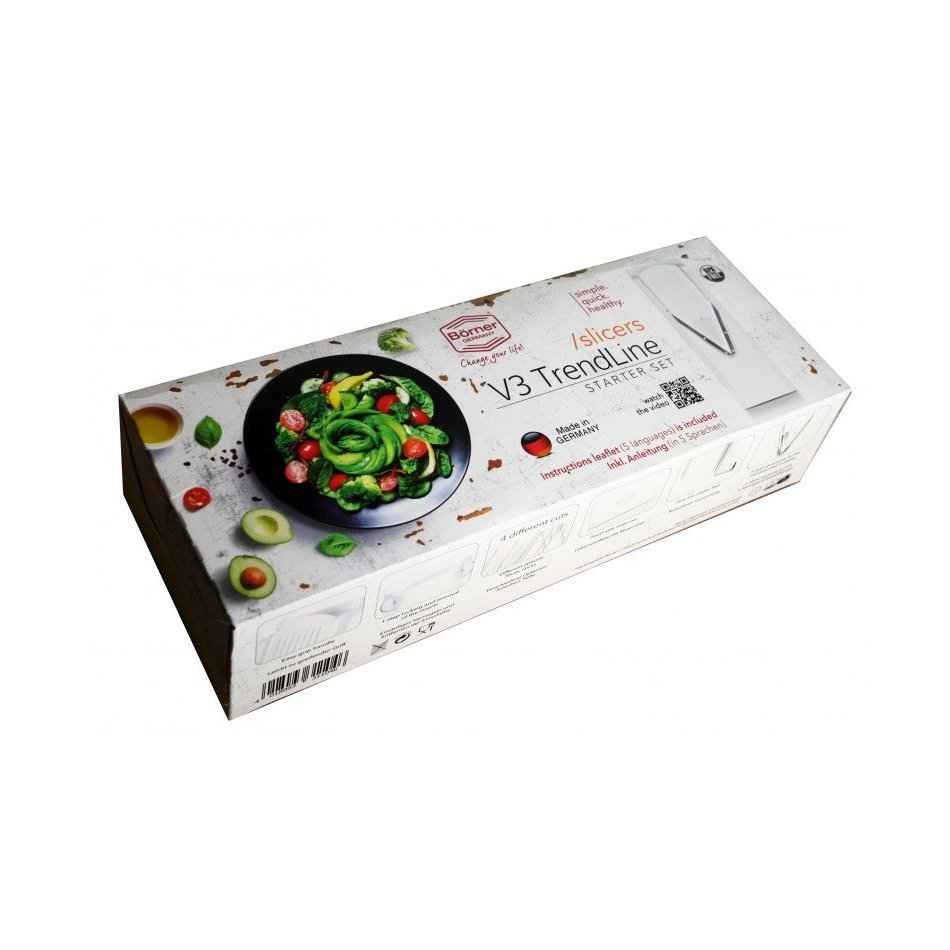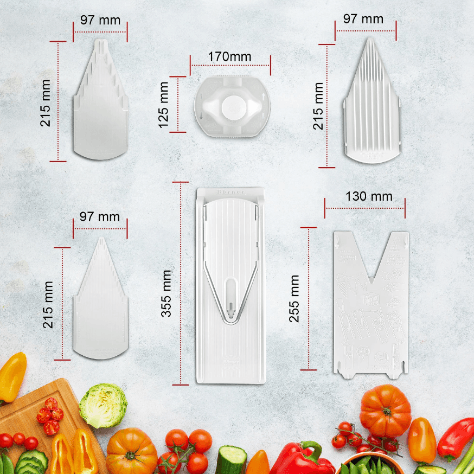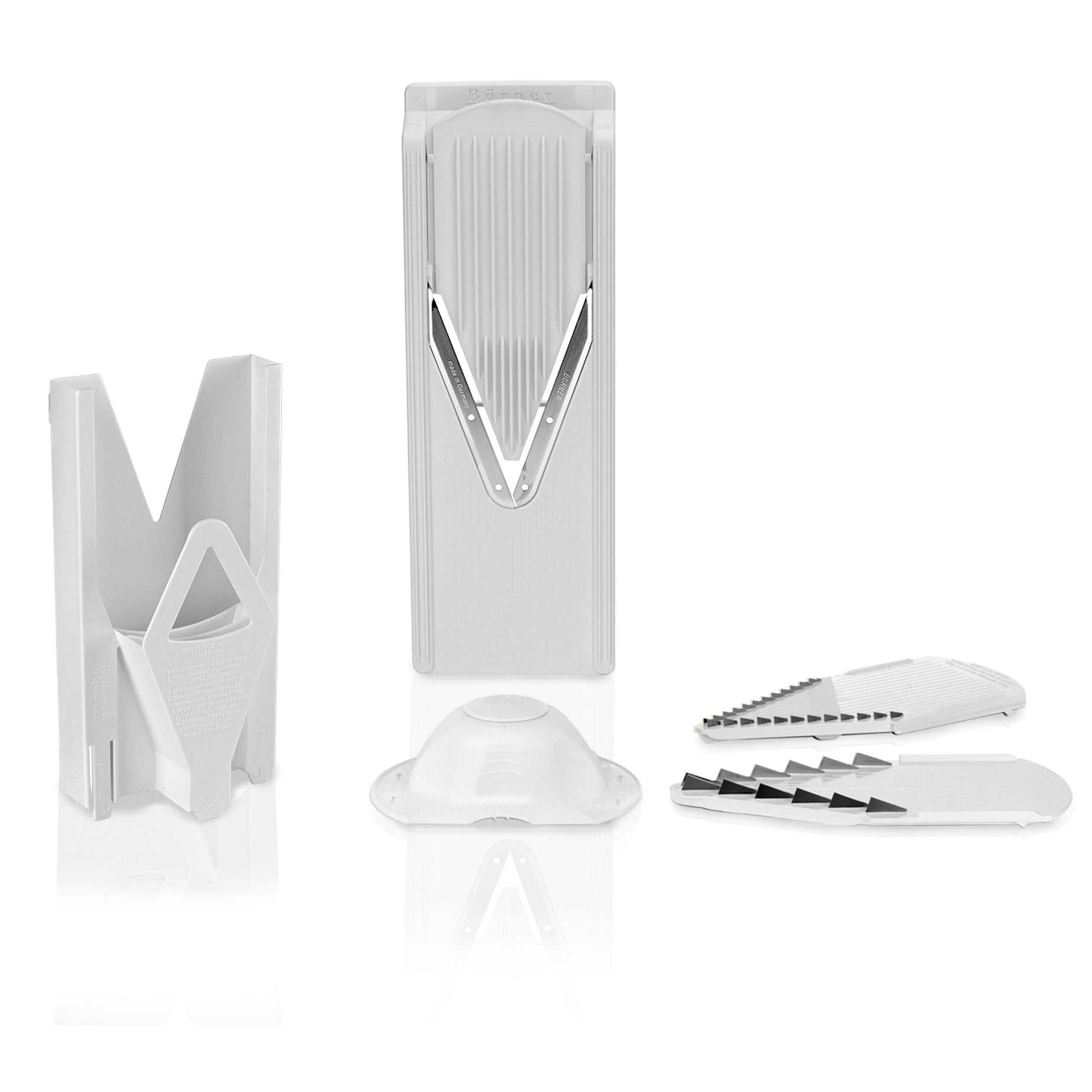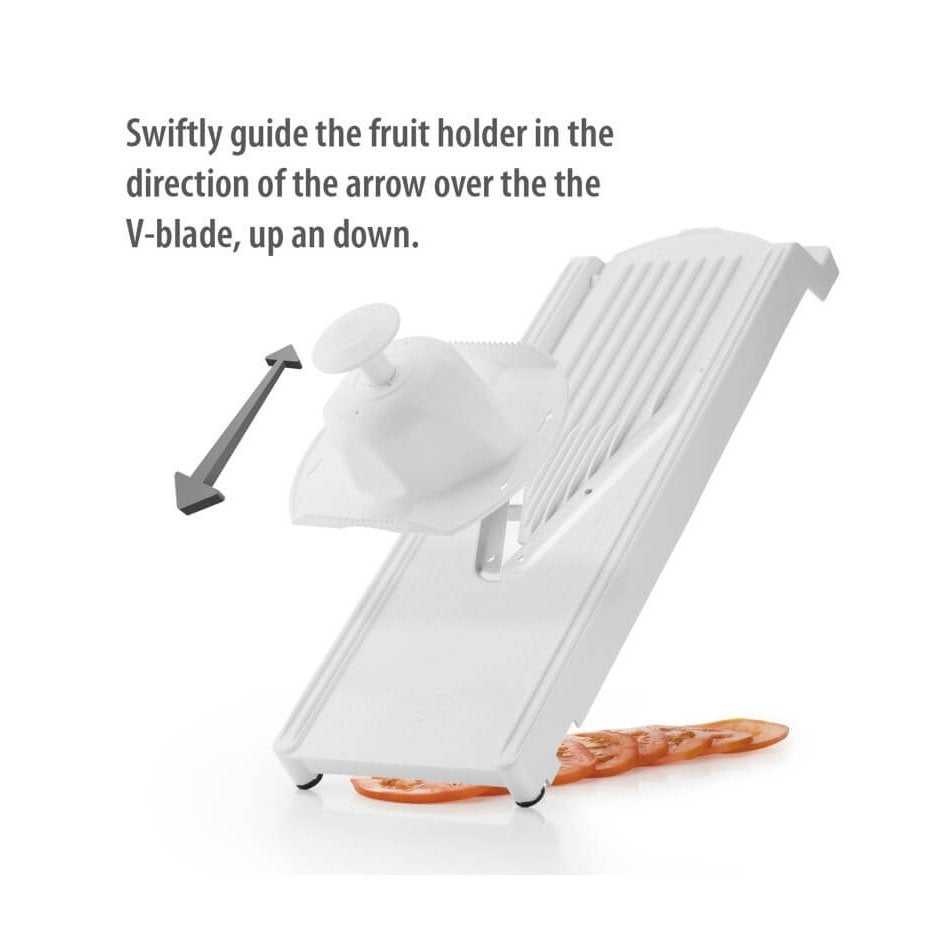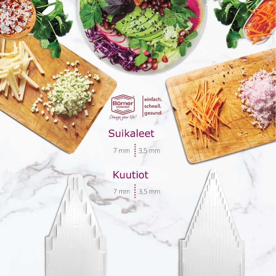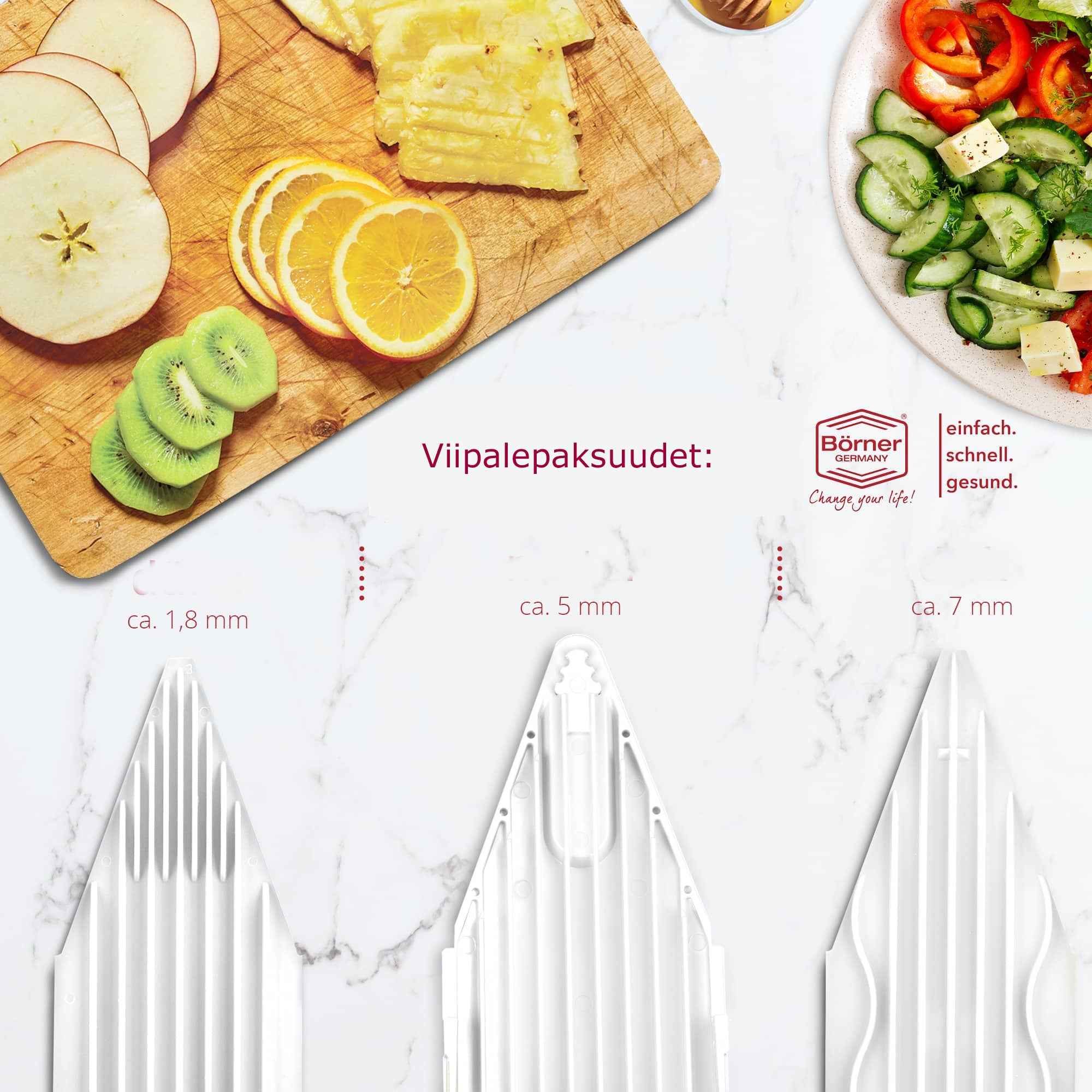Börner V3-mandoliinilla voit tehdä vihanneksista ja hedelmistä sekä ohuita että paksuja viipaleita, suikaleita ja kuutioita.