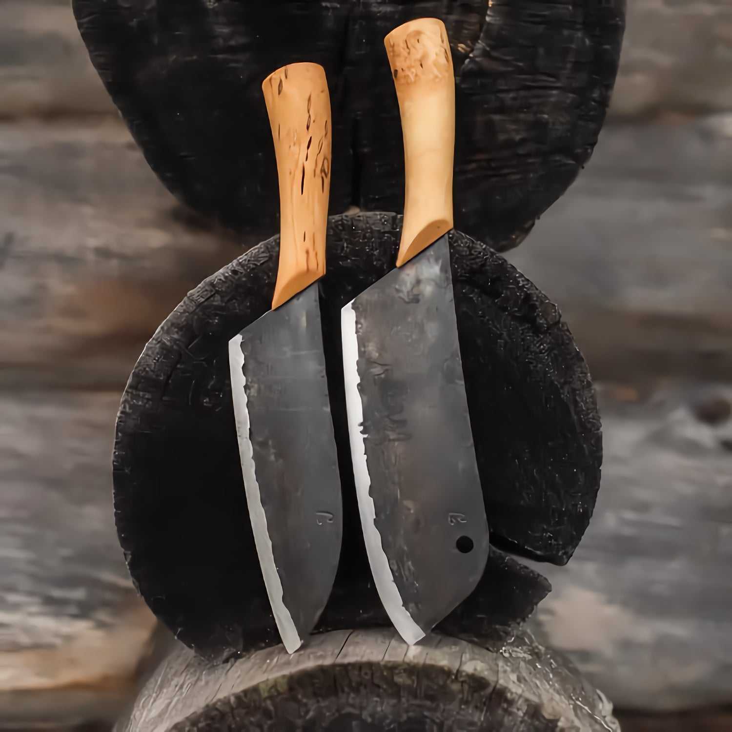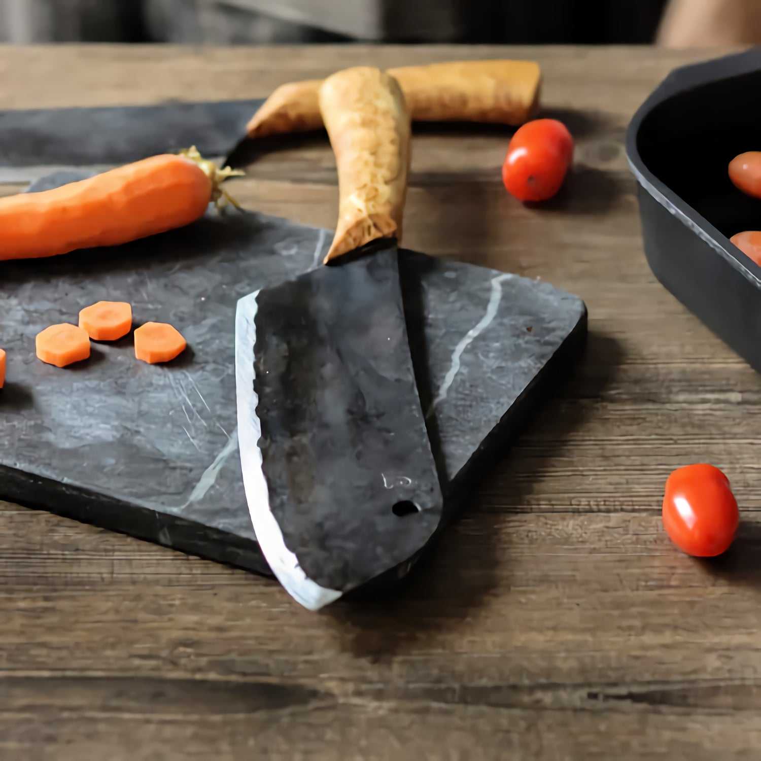 Kotimainen käsityönä valmistettu kokkiveitsi isolla ja leveällä karkaistusta hiiliteräksestä taotulla terällä sekä visakoivusta veistetyllä kahvalla.