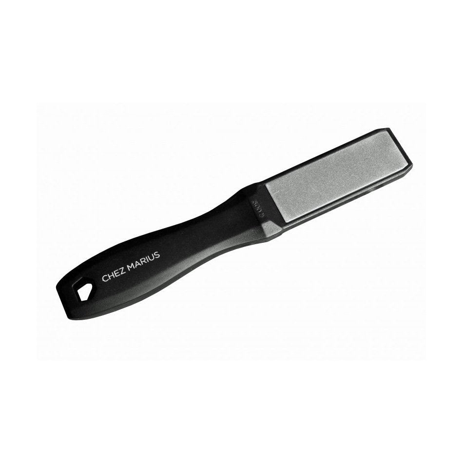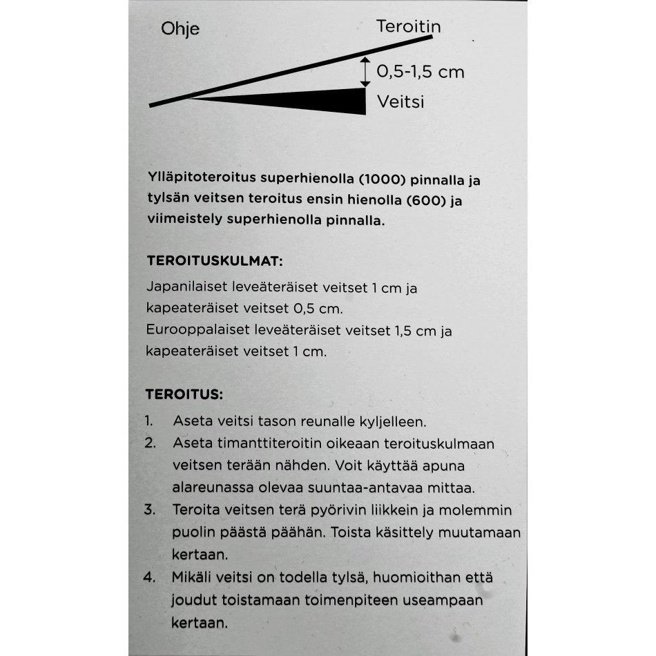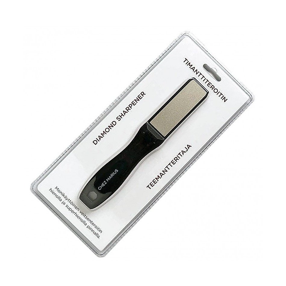 Tukevalla kahvalla varustettu kaksipuoleinen timanttilasta, jossa timanttikarkeudet 1000 / 600 dmi. Timanttipintojen koko 2,4 cm x 7,2 cm. Terottimen kokopituus 19,5 cm.