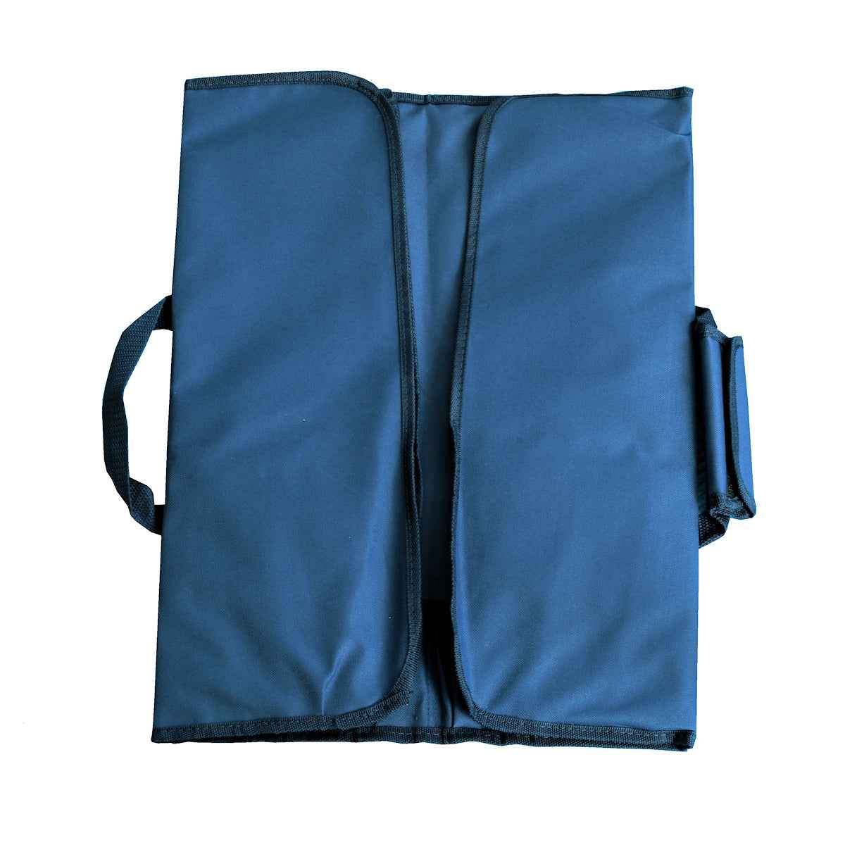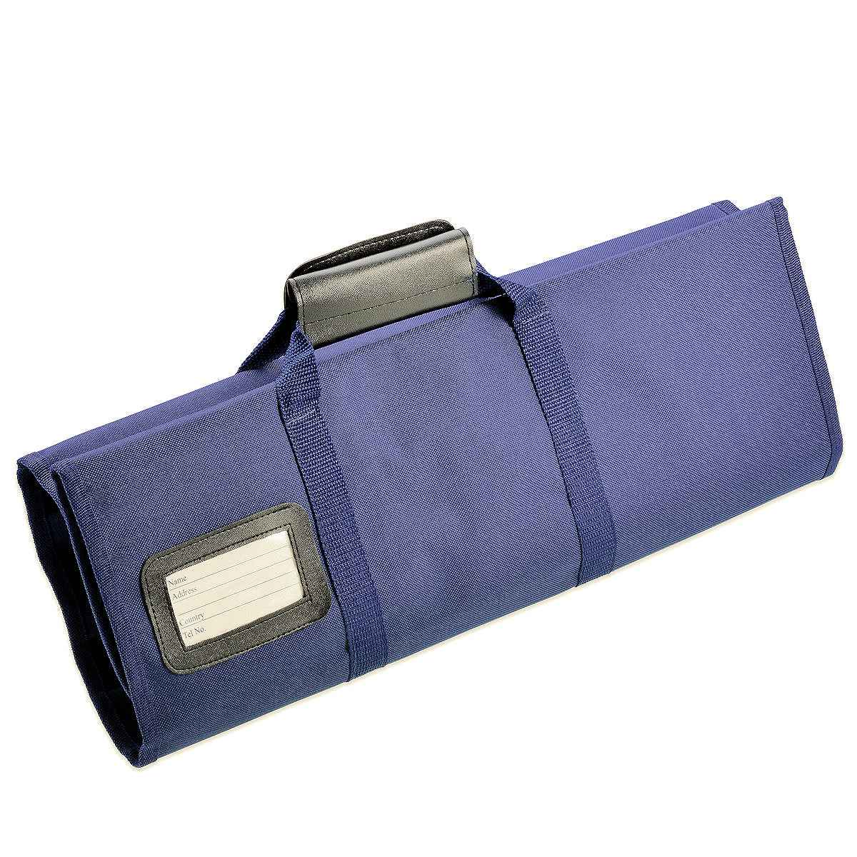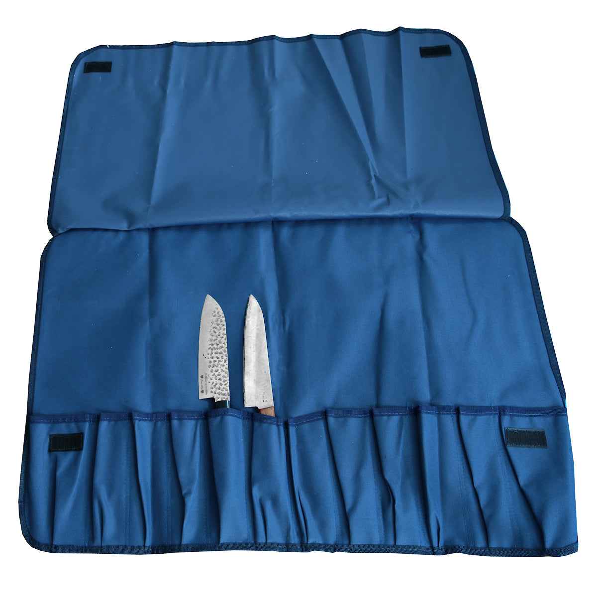 Tukevasta ja kestävästä nailonkankaasta valmistettu tilava veitsilaukku 12 säilytyspaikalla veitsille, teroituspuikolle, saksille tai atuloille. Laukkuun mahtuu veitsi 30 cm:n terällä. Laukku on sininen.