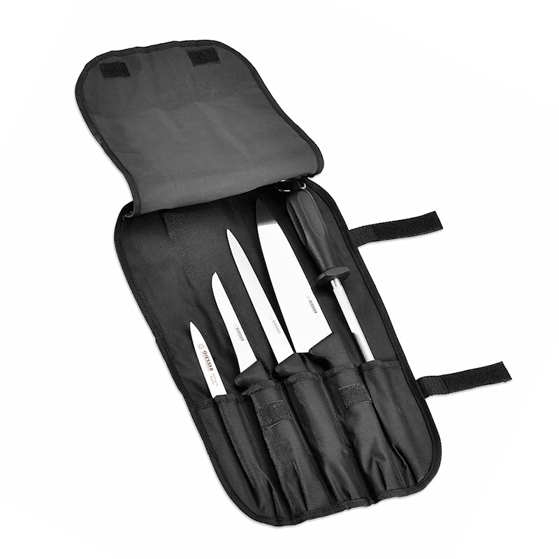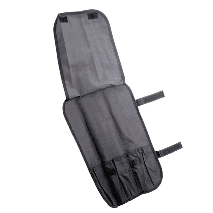 Edullinen veitsilaukku 5:lle veitselle, valmistettu nailonista, sidotaan tarrakiinnityksillä. Ulkopuolella tasku nimikorttille. Kuvan veitset eivät sisälly.