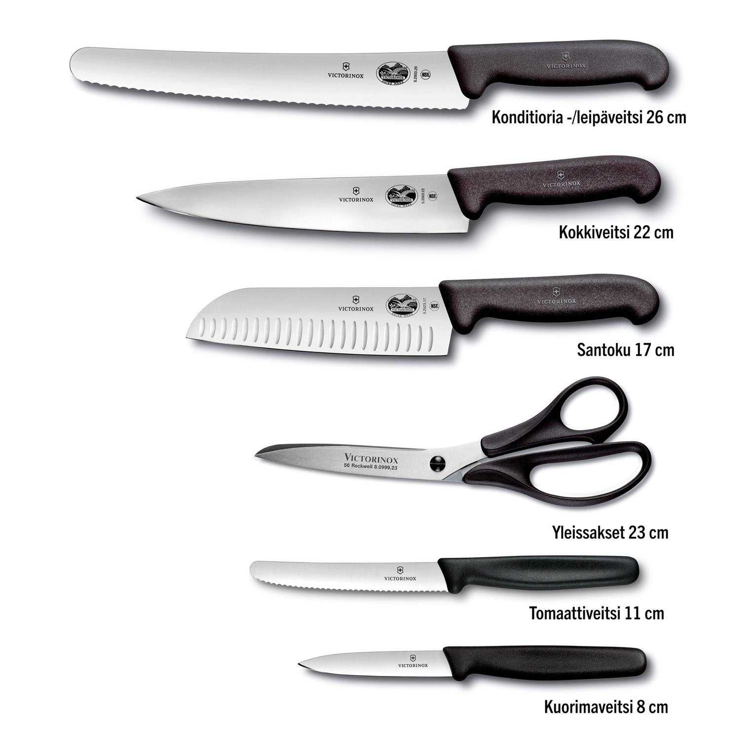 Veitsissä on Victorinoxin Fibrox kahvat, konditoria- ja tomaattiveitsen terässä sahalaita. Santokuveitsen terä on ovaalihiottu. .