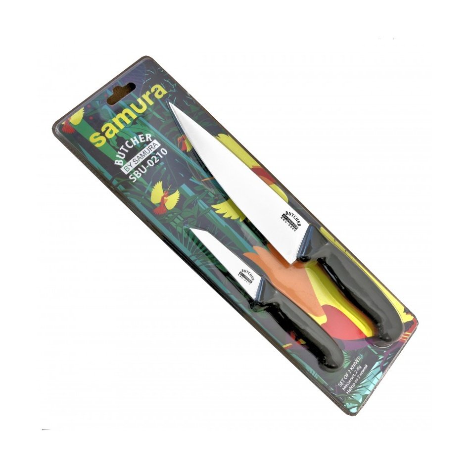 Samura BUTCHER setin veitset on valmistettu ruostumattomasta AUS-8 teräksestä, terän kovuus on 58-59 HRC. Kahvan materiaalina on kestävä TPE-muovi.