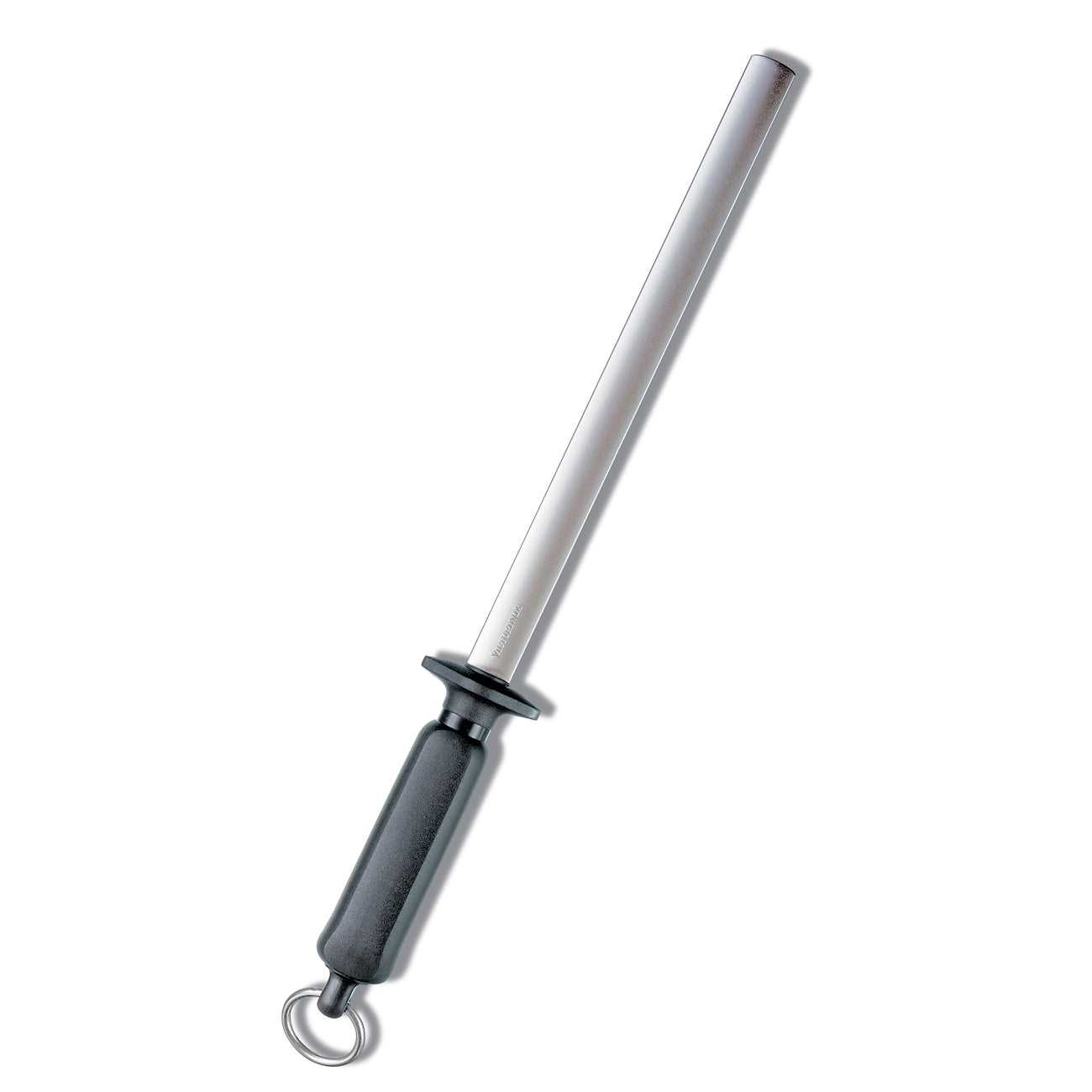 Pienillä keinotimanttikiteillä pinnoitettu ovaali keskihieno puikko. Timanttiteräksellä veitsen saa teräväksi vain parilla vedolla. Musta Fibrox kahva.