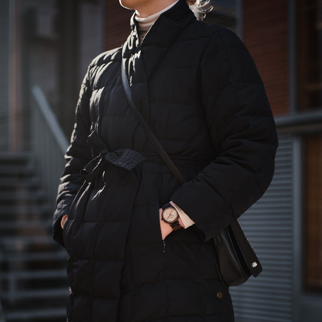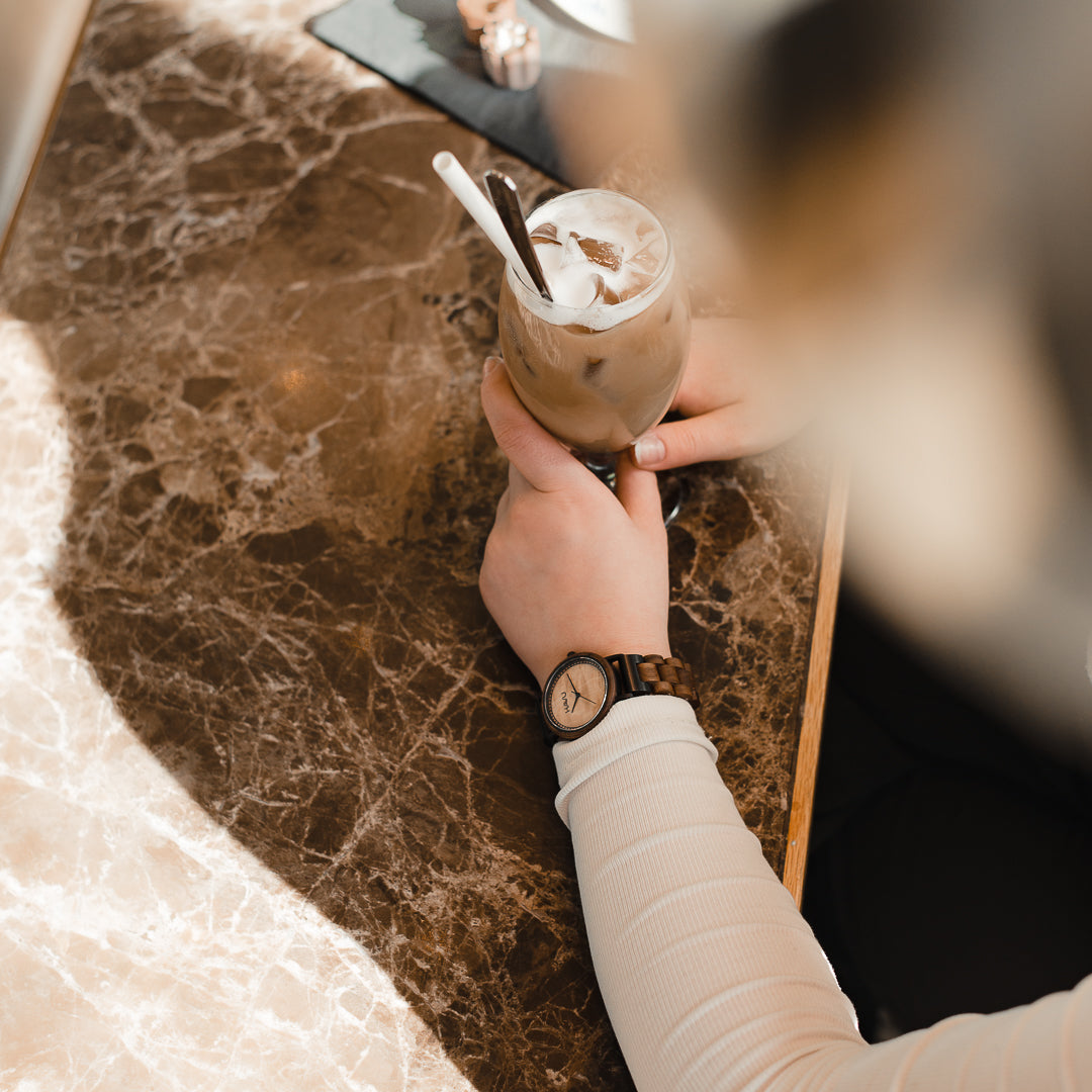 Kellotaulun ja rannekkeen lisäksi rannetta vasten nojaava tausta on puuta, mikä on valtava etu kellon käytössä, sillä puu tuntuu pehmeältä ja kevyeltä iholla. Valitsimme upeaan designiimme ensiluokkaiset materiaalit. Pähkinäpuu on arvostettu ja kestävä puumateriaali, jota on helppo työstää, minkä lisäksi se on kuvioltaan kaunis - siispä se sopii kelloon erinomaisesti. Aavassa on laadukas sveitsiläinen Ronda 763 -kvartsikoneisto, jossa on erittäin tarkka käynti. Rannekkeen ensimmäiset palat ovat metallia, joten Aava kestää erinomaisesti jokapäiväistä käyttöä.
