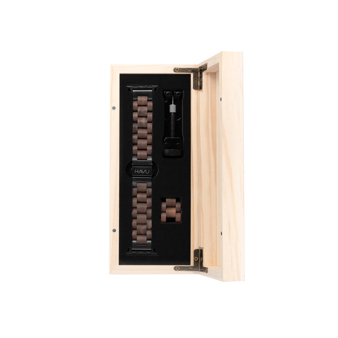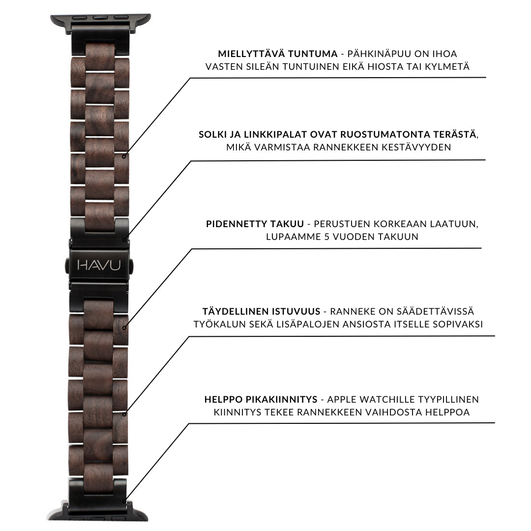 Lämmin ja luonnollinen tyyli Apple Watchiisi! HAVU:n pähkinäpuusta valmistettu Apple Watch -ranneke yhdistää luonnollisen kauneuden ja ajattoman muotoilun. Puun lämmin ruskea sävy ja ainutlaatuinen syykuviointi tekevät jokaisesta rannekkeesta yksilöllisen. Kevyt ja mukava käyttää – täydellinen vaihtoehto niille, jotka arvostavat luonnonmateriaaleja ja tyylikästä muotoilua.