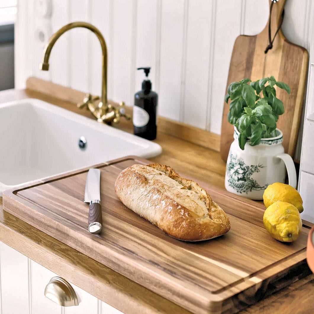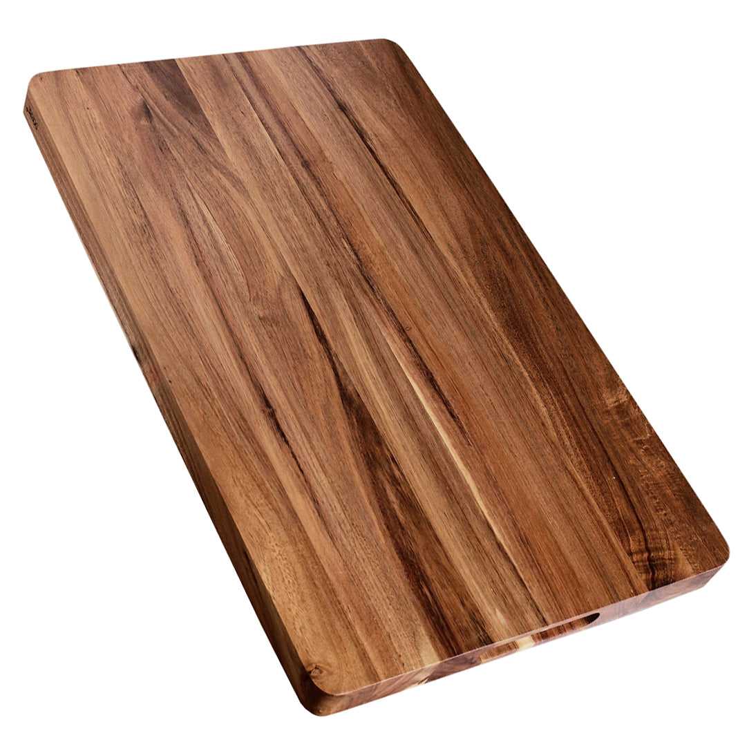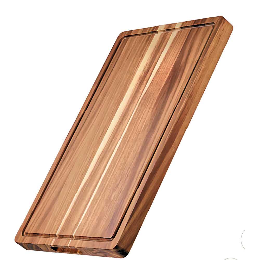 Iso ja tukeva kestävästä akasiapuusta valmistettu leikkuulauta, nesteura toisella puolella. Päissä on syvennykset sormille laudan nostamisen helpottamiseksi.